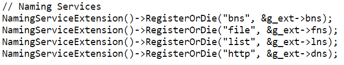这套方式是可扩展的实现了新的NamingService后在global.cpp中依葫芦画瓢注册下就行了,如下图所示:
