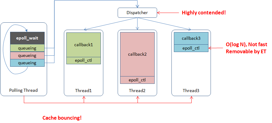 boost::asio is a typical example. One or several threads run event dispatchers respectively. When an event occurs, the event handler is queued into a worker thread to run. This model is extensible from single-threaded reactor intuitively and able to make use of multiple CPU cores. Since sharing memory addresses makes interactions between threads much cheaper, the worker threads are able to balance loads between each other frequently, as a contrast multiple single-threaded reactors basically depend on the front-end servers to distribute traffic. A well-implemented multi-threaded reactor is likely to utilize CPU cores more evenly than multiple single-threaded reactors on the same machine. However, due to cache coherence, multi-threaded reactors are unlikely to achieve linear scalability on CPU cores. In particular scenarios, a badly implemented multi-threaded reactor running on 24 cores is even slower than a well-tuned single-threaded reactor. Because a multi-threaded reactor has multiple worker threads, one blocking event handler may not delay other handlers. As a result, event handlers are not required to be non-blocking unless all worker threads are blocked, in which case the overall progress is affected. In fact, most RPC frameworks are implemented in this model with event handlers that may block, such as synchronously waiting for RPCs to downstream servers.