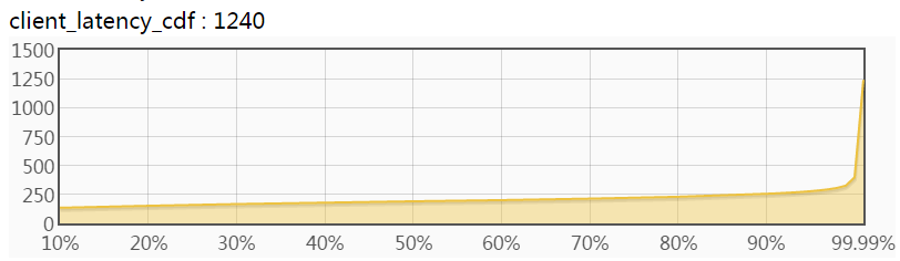 Hovering mouse over the curves shows corresponding values at the time. The tooltip in above diagram means "The 99% percentile of latency before 39 seconds is 330 microseconds". The diagram does not include the 99.99-ile curve which is usually significantly higher than others, making others hard to read. You may click bvars ended with "_latency_9999" to read the 99.99-ile curve separately. This diagram shows how percentiles change over time, which is helpful to analyze performance regressions of systems.