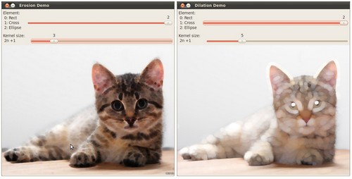 -# Load an image (can be BGR or grayscale) -# Create two windows (one for dilation output, the other for erosion) -# Create a set of two Trackbars for each operation: - The first trackbar "Element" returns either erosion_elem or dilation_elem - The second trackbar "Kernel size" return erosion_size or dilation_size for the corresponding operation. -# Call once erosion and dilation to show the initial image.